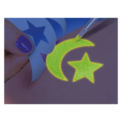 Incluye plantillas adhesivas, purpurinas de colores y tinta corporal que brilla en la oscuridad. ¡Crea diseños tan únicos como tú!