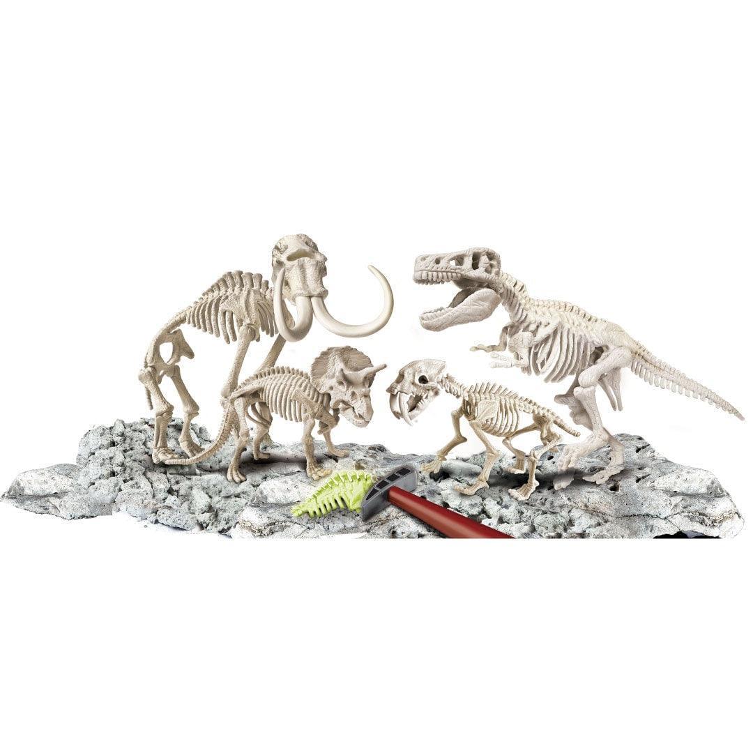 Arma los fósiles fluorescentes de dos dinosaurios(T-rex y Triceratops) y dos animales prehistóricos (Mamut y Smilodon) y coleccionalos obsérvalos como iluminan en la oscuridad.