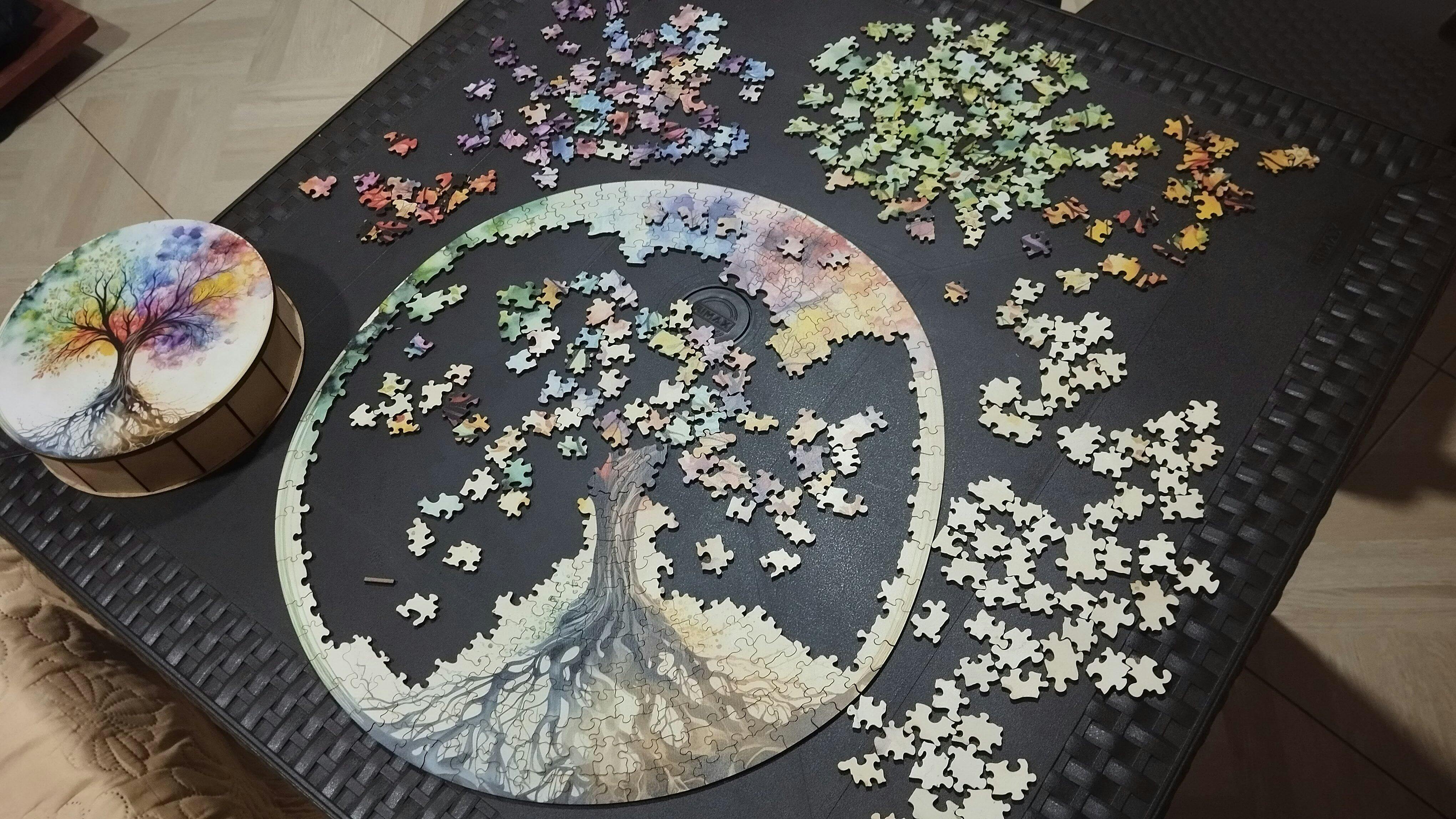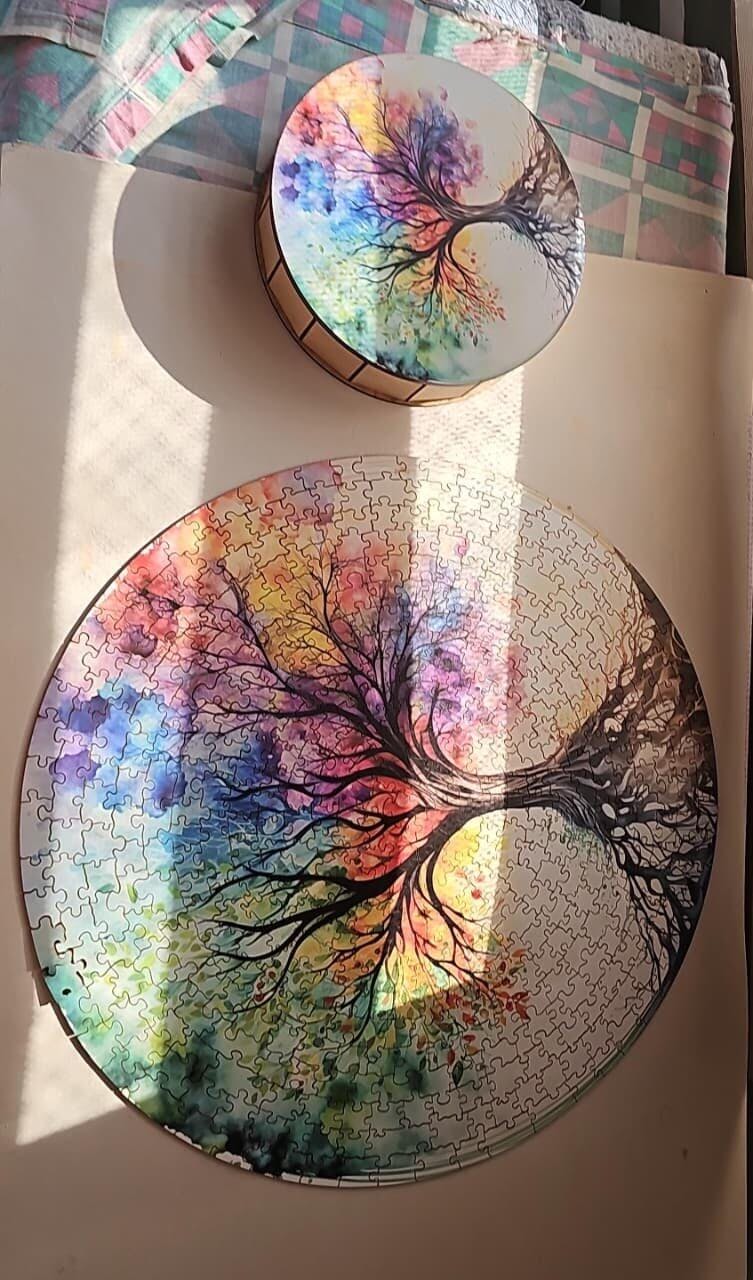 Este rompecabezas redondo de 500 piezas en madera rompe la rutina y te invita a una experiencia visual y emocional única: El Árbol de la Vida, símbolo de conexión, armonía y sabiduría ancestral 🌿.